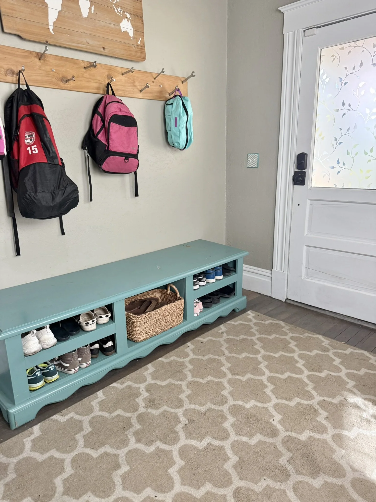 Add a small bench with baskets underneath for shoes, and use hooks or a wall organizer for bags, backpacks, and keys. If space allows, include a tray for mail or returns — anything that tends to pile up near the door.